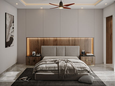 Design and Consultancy project for a 250 yards Modern House in Sector 45 with clean lines, open spaces, and functional elements. Architectural features include a dedicated parking area, four floors with ample living and entertainment areas, and extensive use of wood and louvers. The color palette is a soothing scheme of cream, brown, and white with accents.